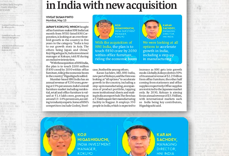 Read MoreJapan's Kokuyo aims to grow its office furniture business in India over three-fold in five years following its acquisition of HNI India. HNI is key player in office furniture; has plant in Nagpur; export plans included, say top executives