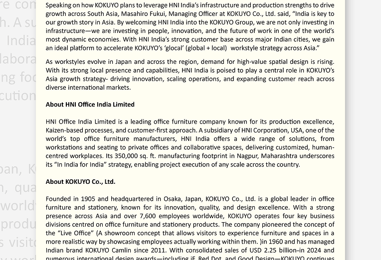Kokuyo Workplace India Limited (Formerly HNI Office India Limited) is part of one of the world’s largest workplace furnishings manufacturers and a global leader in seating solutions.