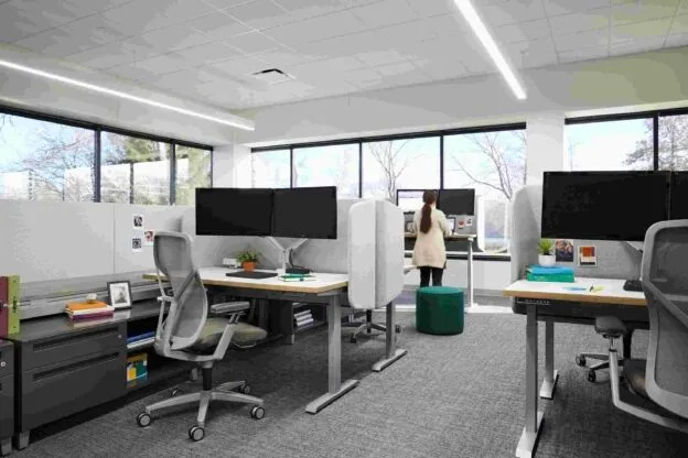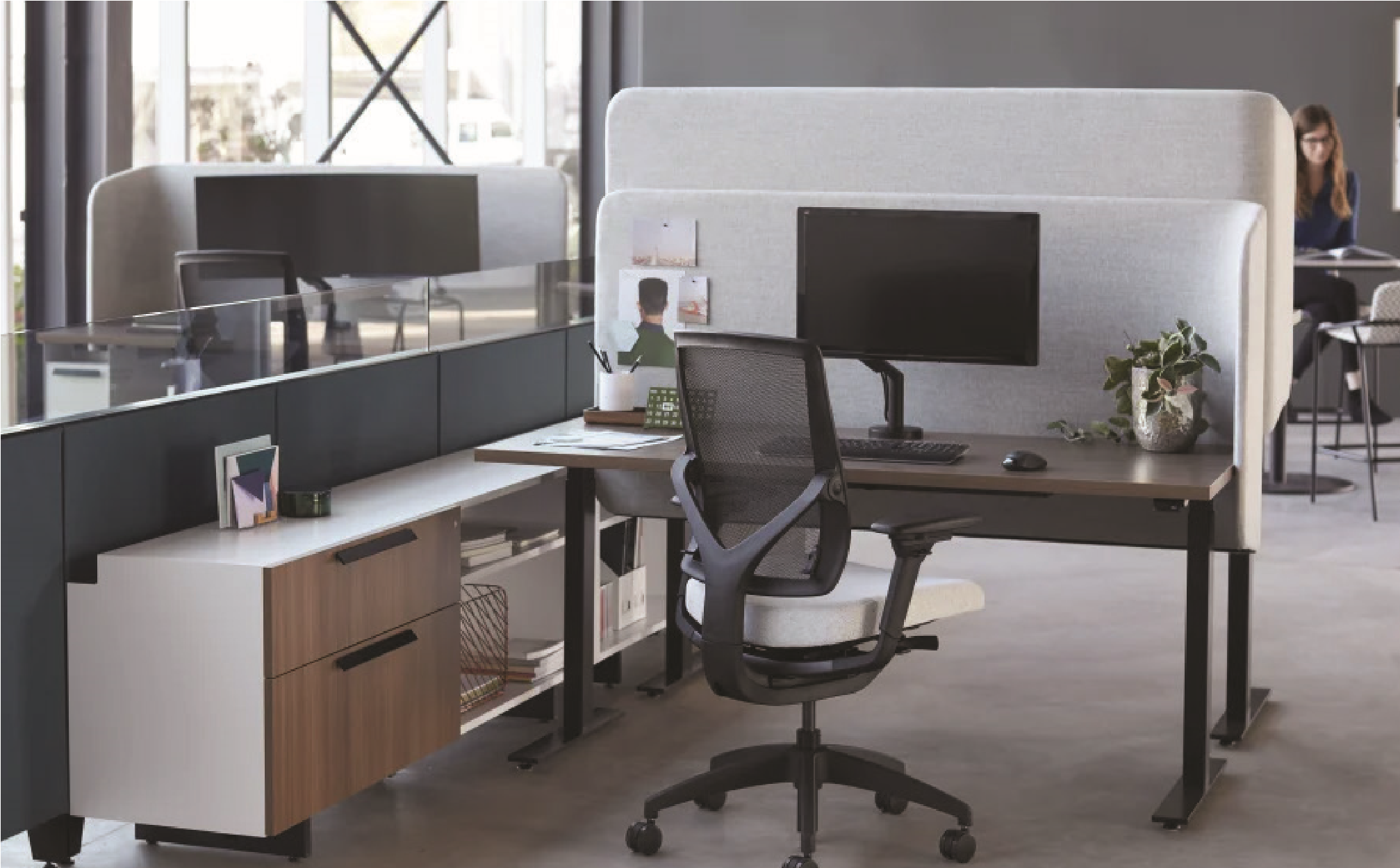 Approachability – considerations for creating welcoming workstations. Employees may appreciate feeling connected to their colleagues. Visibility for the employee should be considered during workstation design. When using panels, consider using lower panels on the side to create line-of-sight to the individual. In benching applications, consider space division opportunities. Additionally, consider how individuals in private offices or at reception desks would like to greet approaching visitors. This may have implications for the location of an adjustable worksurface.