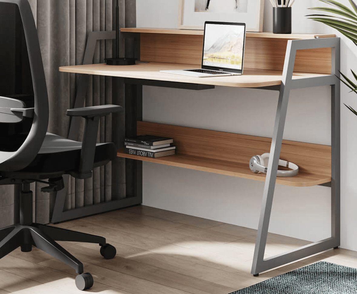 Elevate your workspace with the Kokuyo India IVO Ergonomic design desk, featuring a sleek wooden top and metal-framed steel finish support with stylish angular legs for a modern and sophisticated look.
