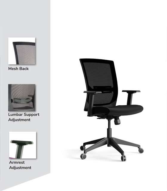 • Enjoy standard ergonomic features including seat height adjustment, height-adjustable armrests, and lumbar support, providing optimal comfort and support during extended work sessions.