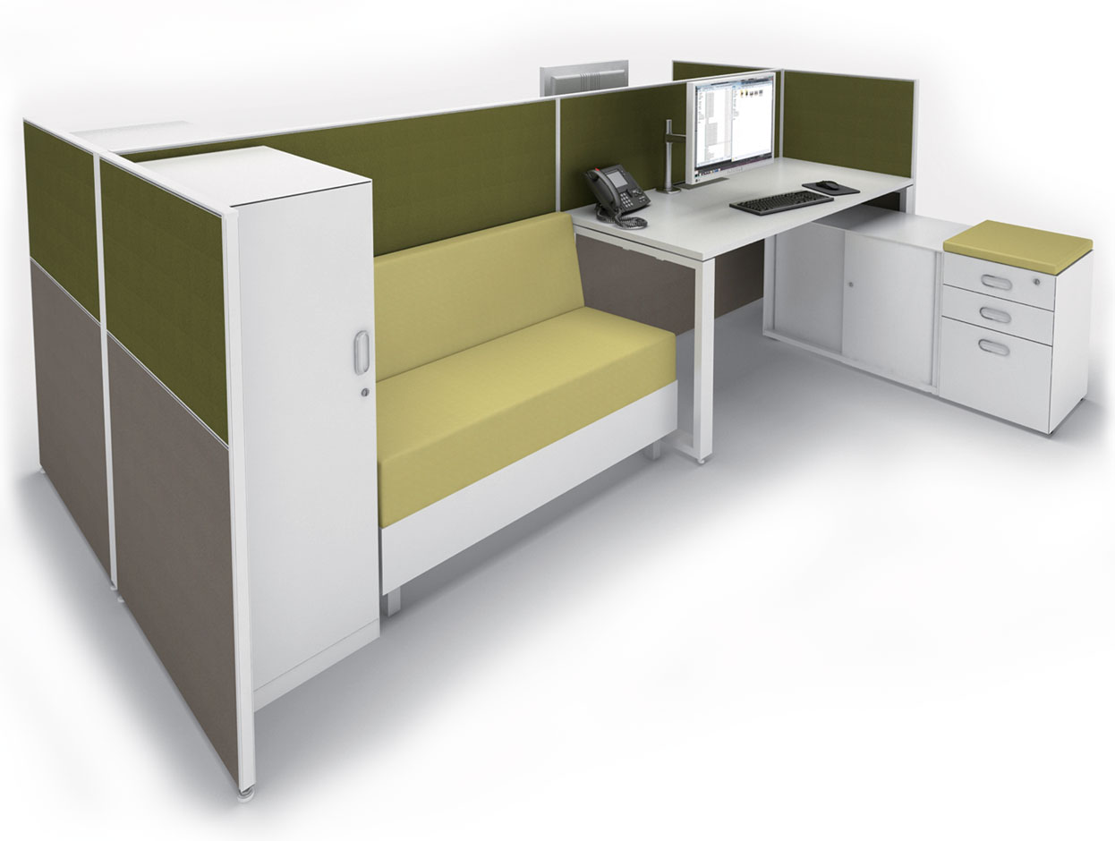 Wires run and plug in behind worksurfaces and out of the way in an integrated trough designed into storage units, eliminating the need for worksurface grommets.